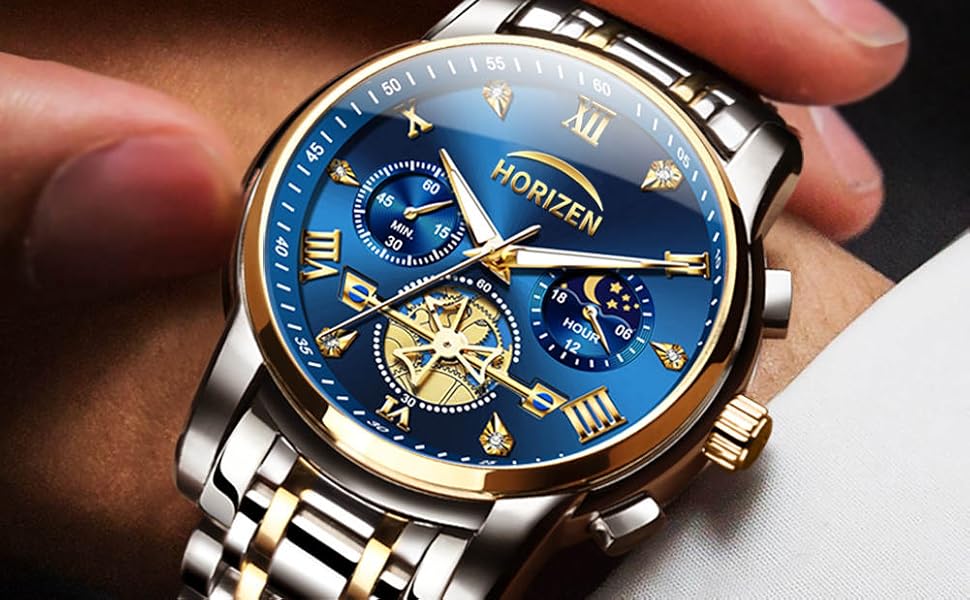 The HORIZEN Chronograph Watch delivers a luxurious look with its striking blue dial and polished stainless steel build. Its precise timekeeping and durable design make it ideal for daily wear or special occasions. A great pick for men seeking elegance, reliability, and modern sophistication in one accessory.